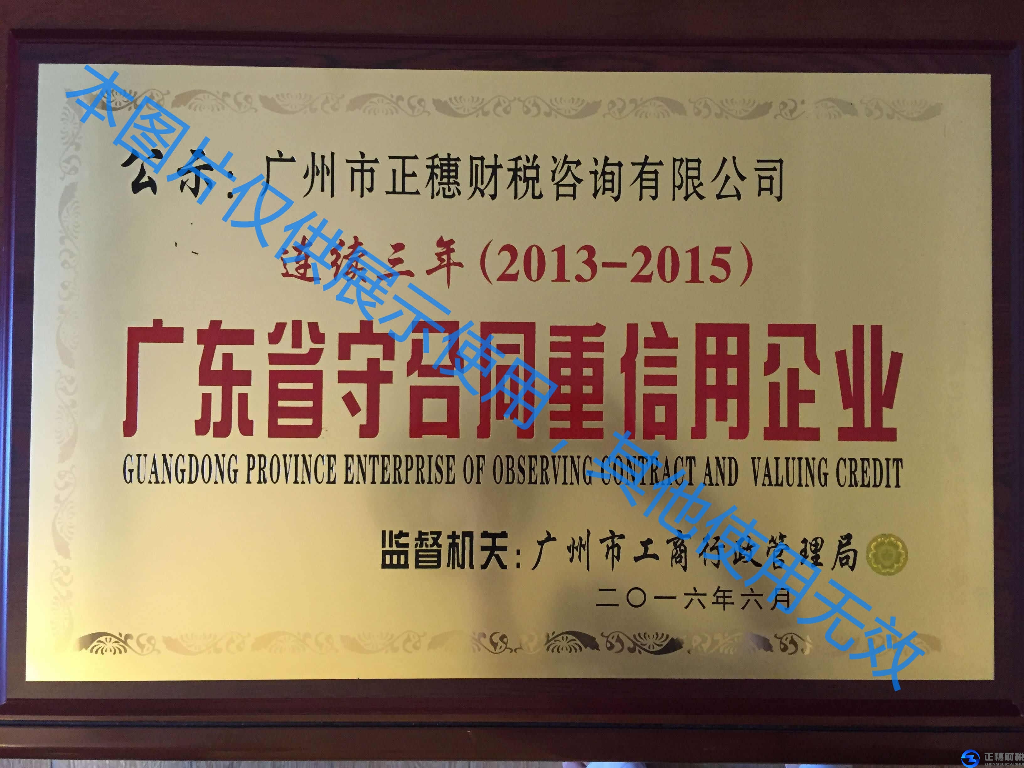 好消息!好消息!憑著良好的信譽(yù)和業(yè)績(jī),廣州市正穗財(cái)稅咨詢有限公司連續(xù)三年被廣州市工商行政管理局評(píng)為“廣東省守合同重信用企業(yè)”,并獲得工商局領(lǐng)導(dǎo)親自頒發(fā)該牌匾。